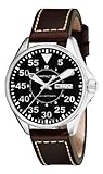 Stainless steel case with a brown leather strap with contrast stiching. Fixed stainless steel bezel. Black dial with luminous hands and Arabic numeral minute markers (at 5 minute intervals) hour markers. Arabic numeral hour markers around an inner ring. Minute markers around the outer rim. Luminiscent hands and markers. Date and day of the week display at the 3 o'clock position. Automatic movement. Scratch resistant sapphire crystal. Textured steel crown. Solid case back. Case diameter: without crown 38mm with crown 42mm case thickness 12.5mm. Deployment clasp. Water resistant at 50 meters / 165 feet. Hamilton Khaki Pilot Automatic Mens Watch H64425535 Automatic movement Stainless steel case Black day date dial Brown leather strap; Buckle Water-resistant to 660 feet (200 M)
